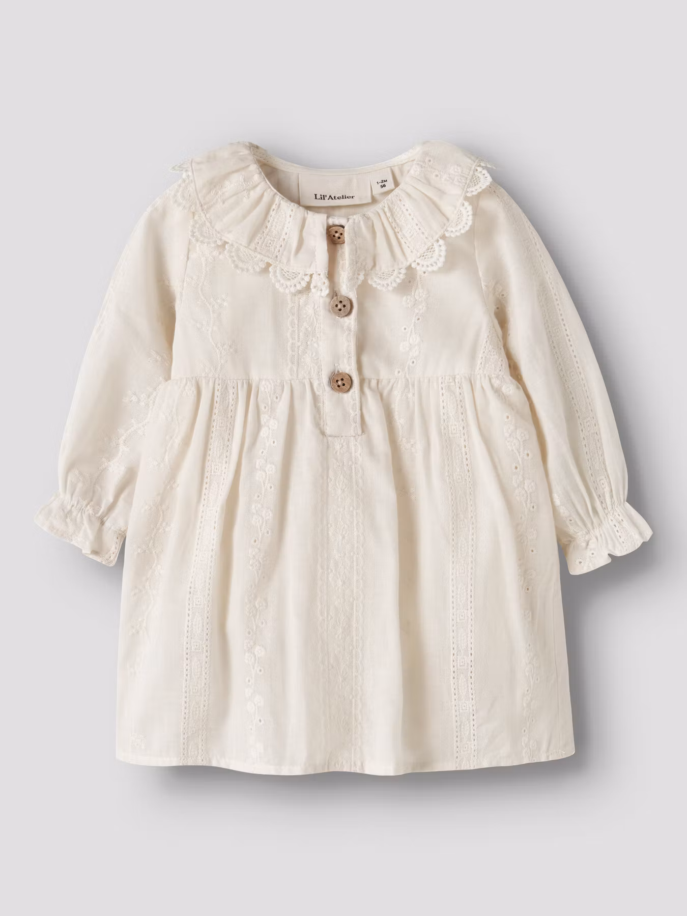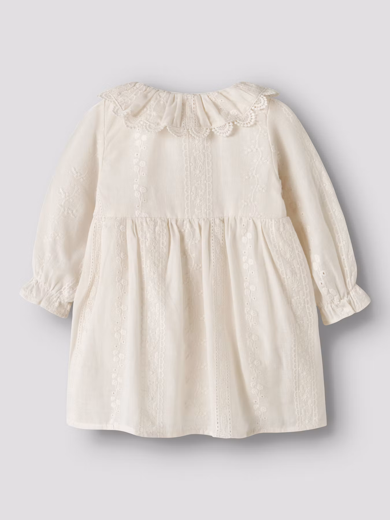 Luftig bodyklänning i ekologisk bomull med broderi och volangdetaljer – perfekt för både vardag och finare tillfällen.