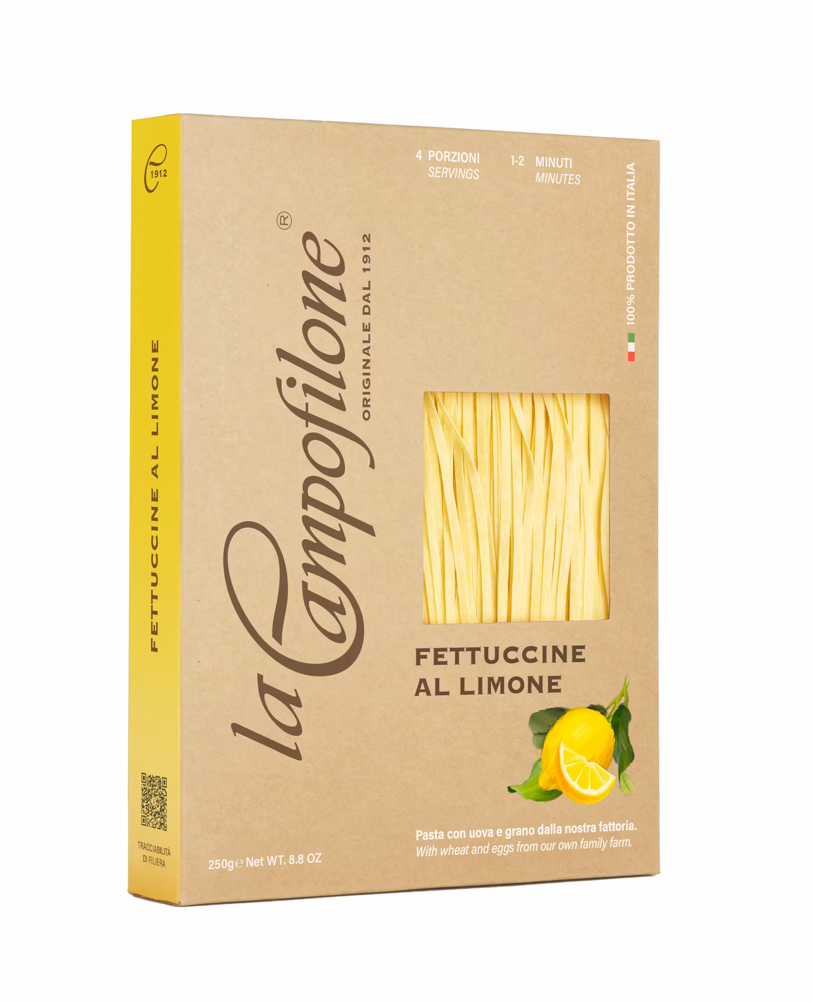 Fettuccine med citron. "La Campofilone" har en utsökt smak och en inbjudande doft av äkta siciliansk citron. Tillverkad endast med naturliga ingredienser, utan färgämnen eller konserveringsmedel. Överraska dina gäster med Fettuccine med citron, rivet skal, citronsaft och remsor av rå skinka: det är en riktig fröjd!