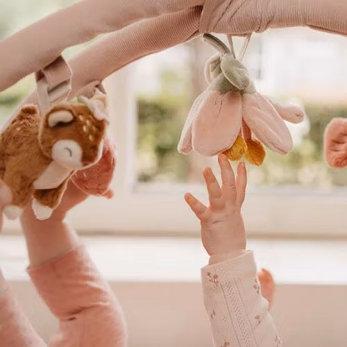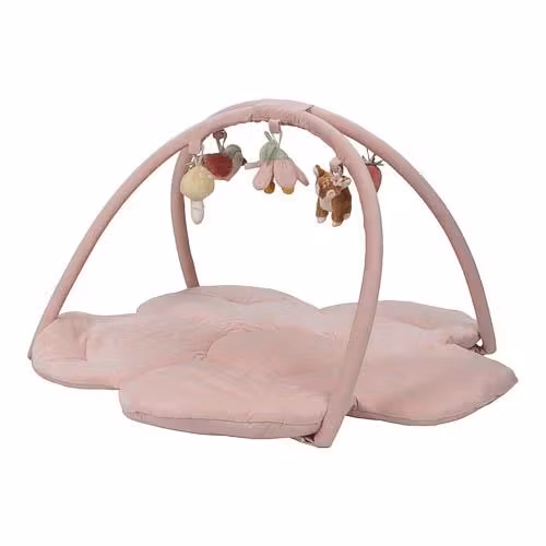 Den blomformade aktivitetsmattan är designad i en ljusrosa ton och dekorerad med två sammetsrosetter samt fem hängande mjukisdjur: en liten hjort, en fågel, en blomma, en svamp och en jordgubbe. De olika formerna, materialen och detaljerna stimulerar barnets sensoriska färdigheter och hand-öga-koordination på ett lekfullt och tryggt sätt.