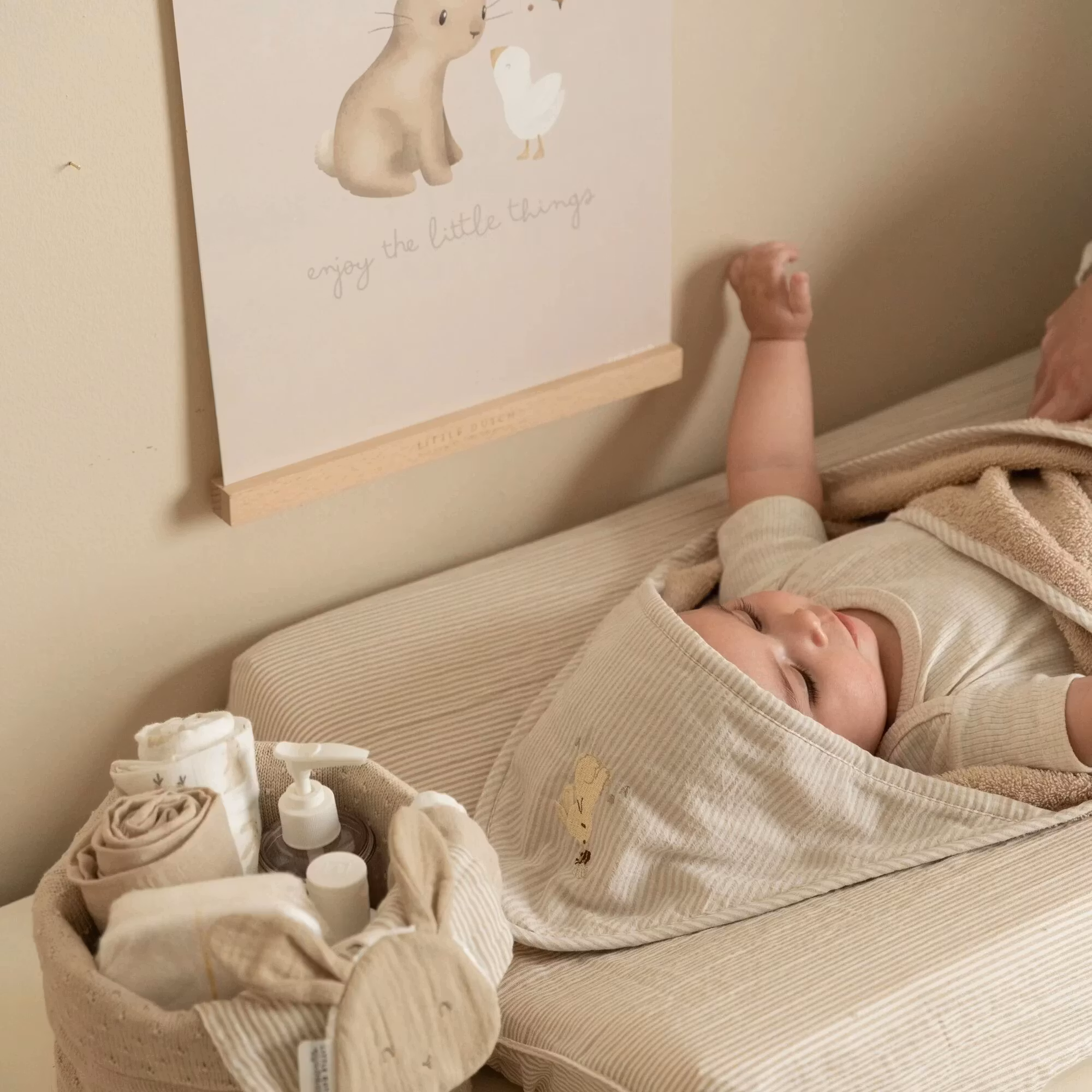 Den praktiska huvan håller barnets huvud varmt och torrt samtidigt som den ger en känsla av trygghet – och det söta Baby Bunny-trycket gör handduken lika charmig som funktionell.