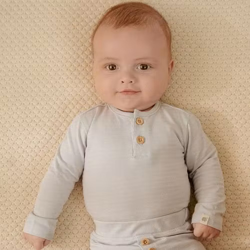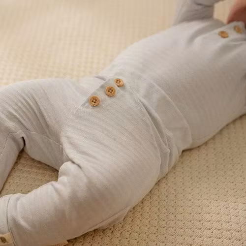 De träliknande knapparna framtill tillför en naturlig touch, medan tryckknapparna i grenen gör det enkelt att klä på och byta blöja. Den här bodyn kombinerar praktisk komfort med klassisk design – perfekt för både vardag och speciella stunder.