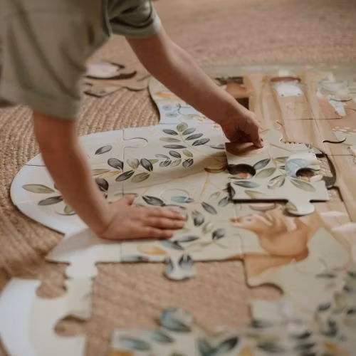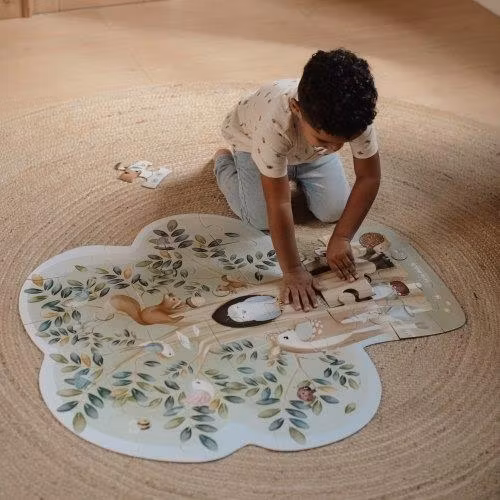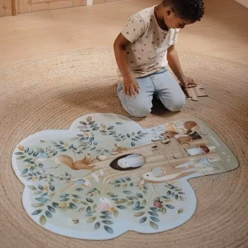 Golvpussel Skogsvänner från Little Dutch är ett stort och detaljrikt barnpussel som bjuder in till lek, fantasi och upptäckarglädje. Det vackra motivet visar ett stort träd fullt av liv – här gömmer sig en ekorre som samlar ekollon, fåglar som bygger bon, surrande insekter och en vänlig räv som smyger i skogen.