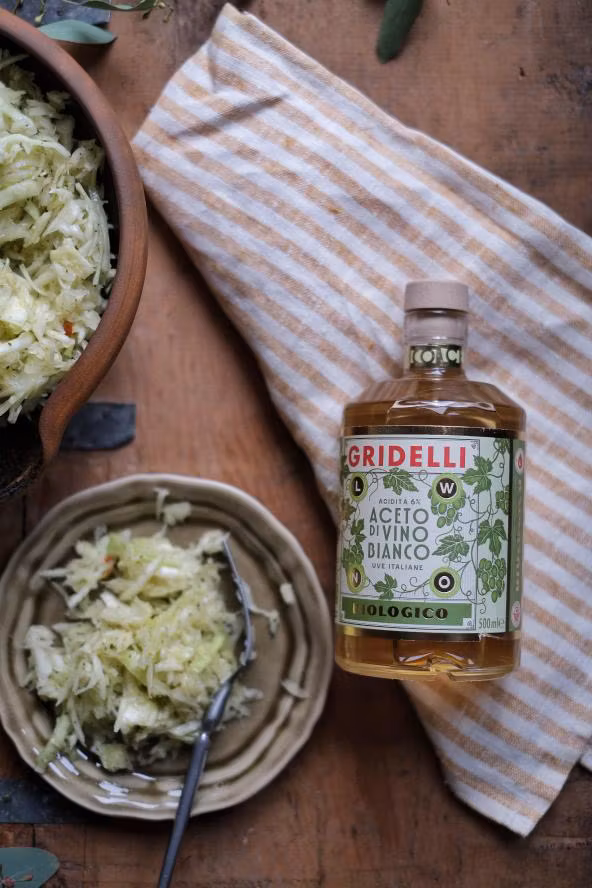 Frisk, elegant och naturligt syrlig – Aceto di Vino Bianco från Fratelli Gridelli är en klassisk vitvinsvinäger tillverkad av 100 % ekologiska Trebbianodruvor från Emilia-Romagna i Italien.