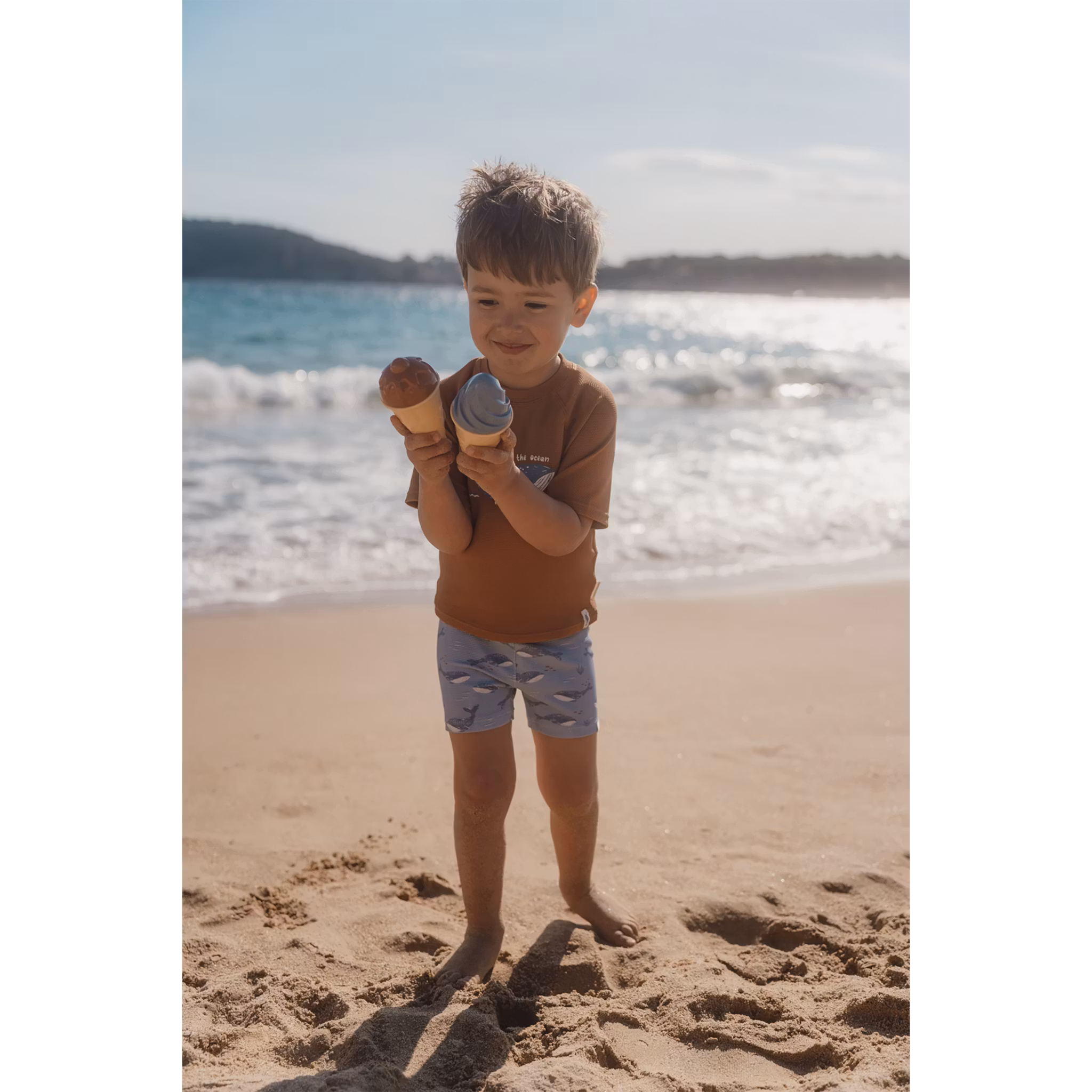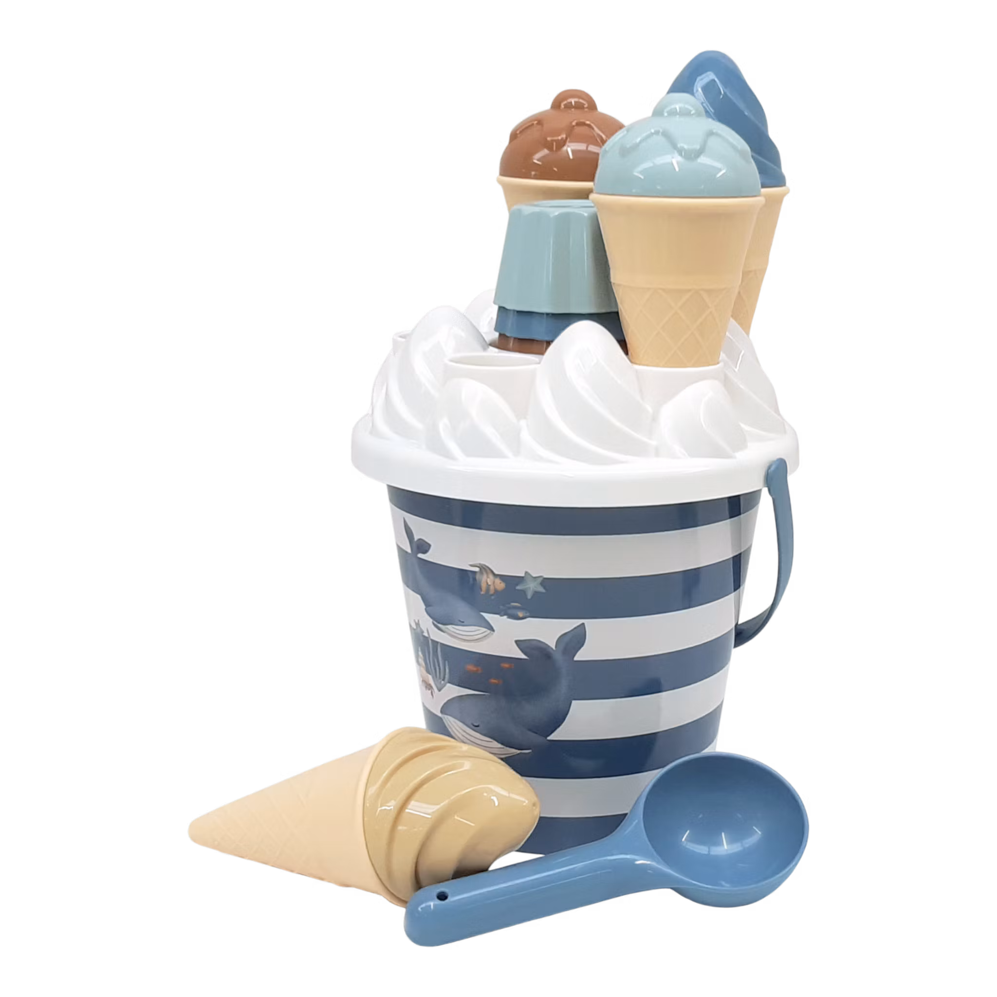 Varje set innehåller en glasshink, färgglada glassformar och en sked, tillverkade i slitstarkt material för långvarig lek. Barnet kan skapa egna glasskreationer i sanden eller låtsas servera glass under sommarens äventyr – perfekt för rollekar som stimulerar fantasi, kreativitet och finmotorik.