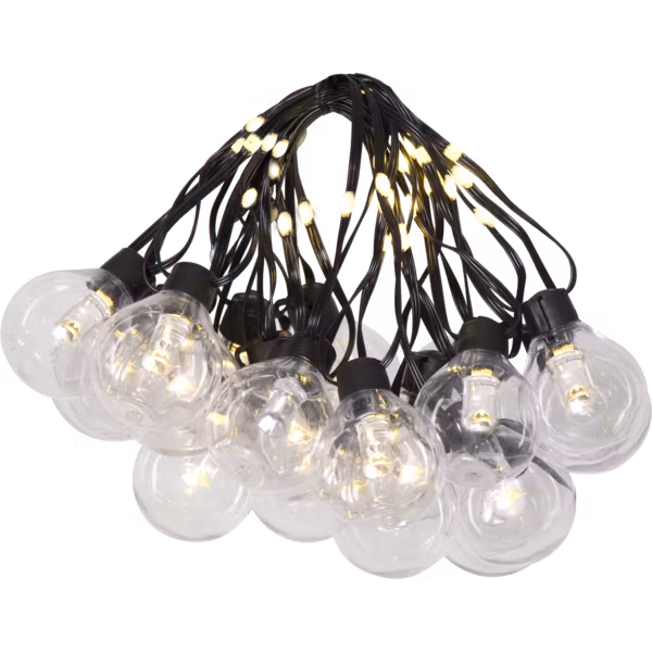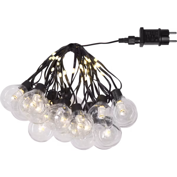 Skapa stämning året runt med Bolla, en vacker och mångsidig ljusslinga för utomhusbruk från Star Trading. Slingan är utrustad med 20 klara glober (4 cm) – och mellan varje glob finns ytterligare 2 små varmvita ljuspunkter som ger ett mjukt, levande sken. Perfekt för både vardagsmys, altanen, pergolan och festliga tillfällen.