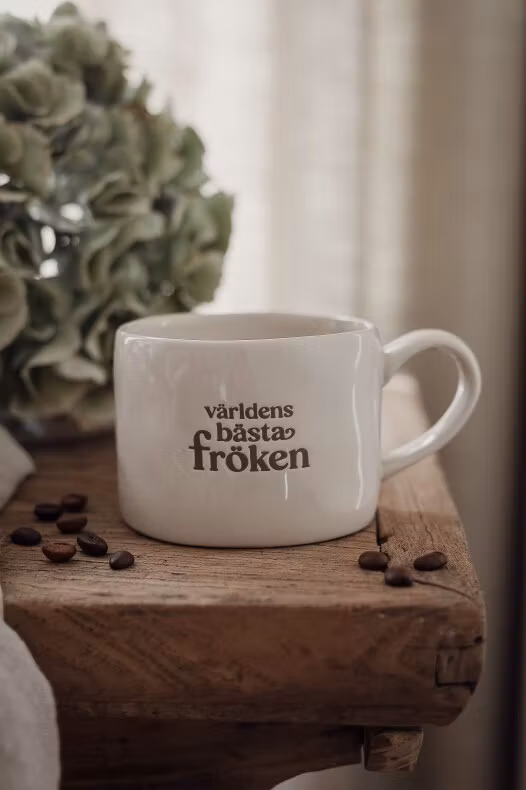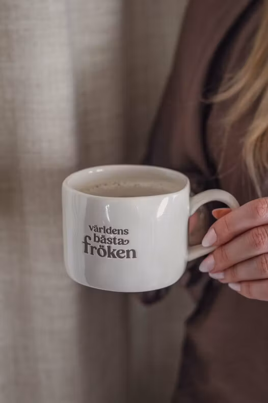 Fin mugg med texten Världens bästa fröken från Majas Cottage. Stengodsmugg med handgjord känsla. Rymmer ca 3 dl och tål diskmaskin och mikrovågsugn.