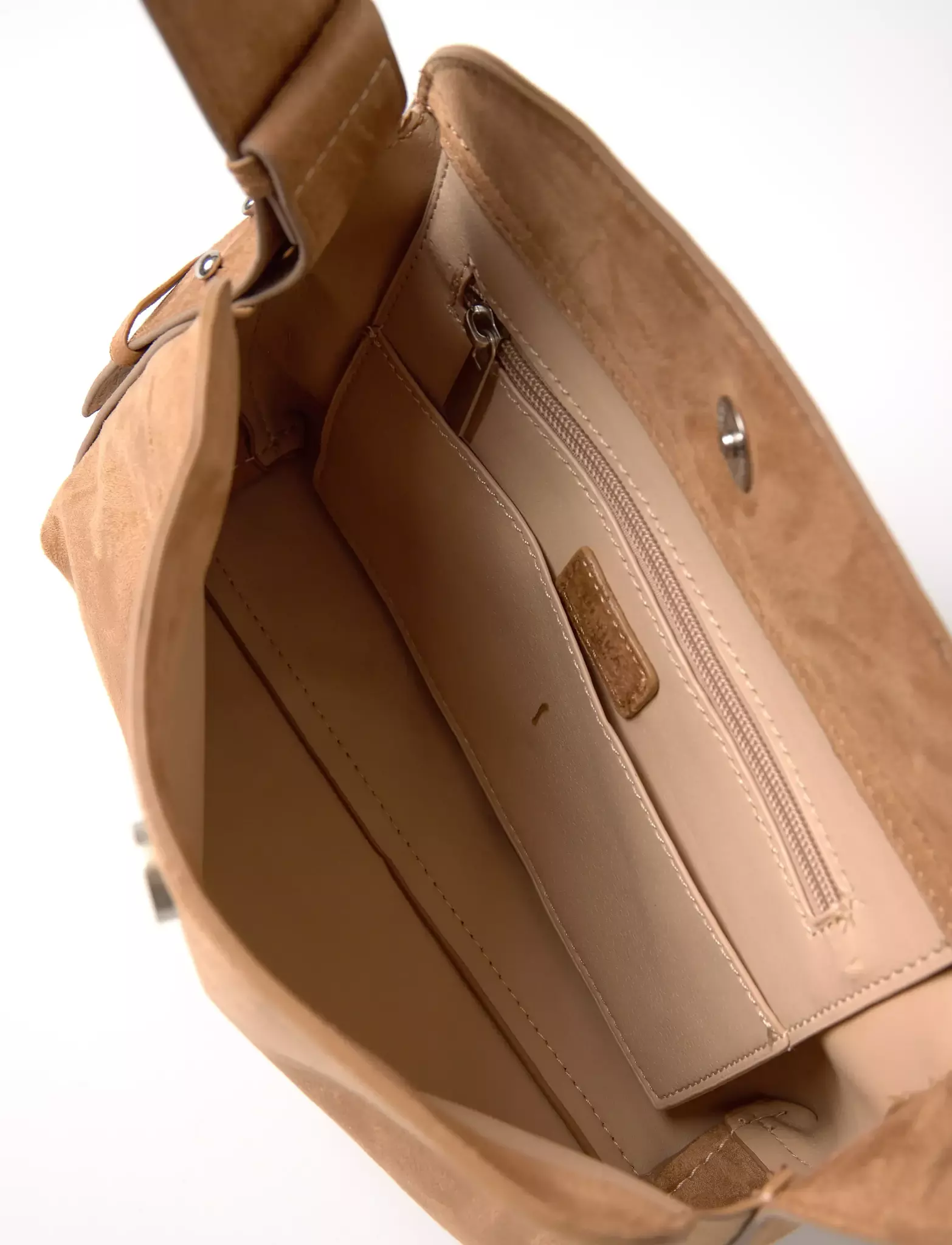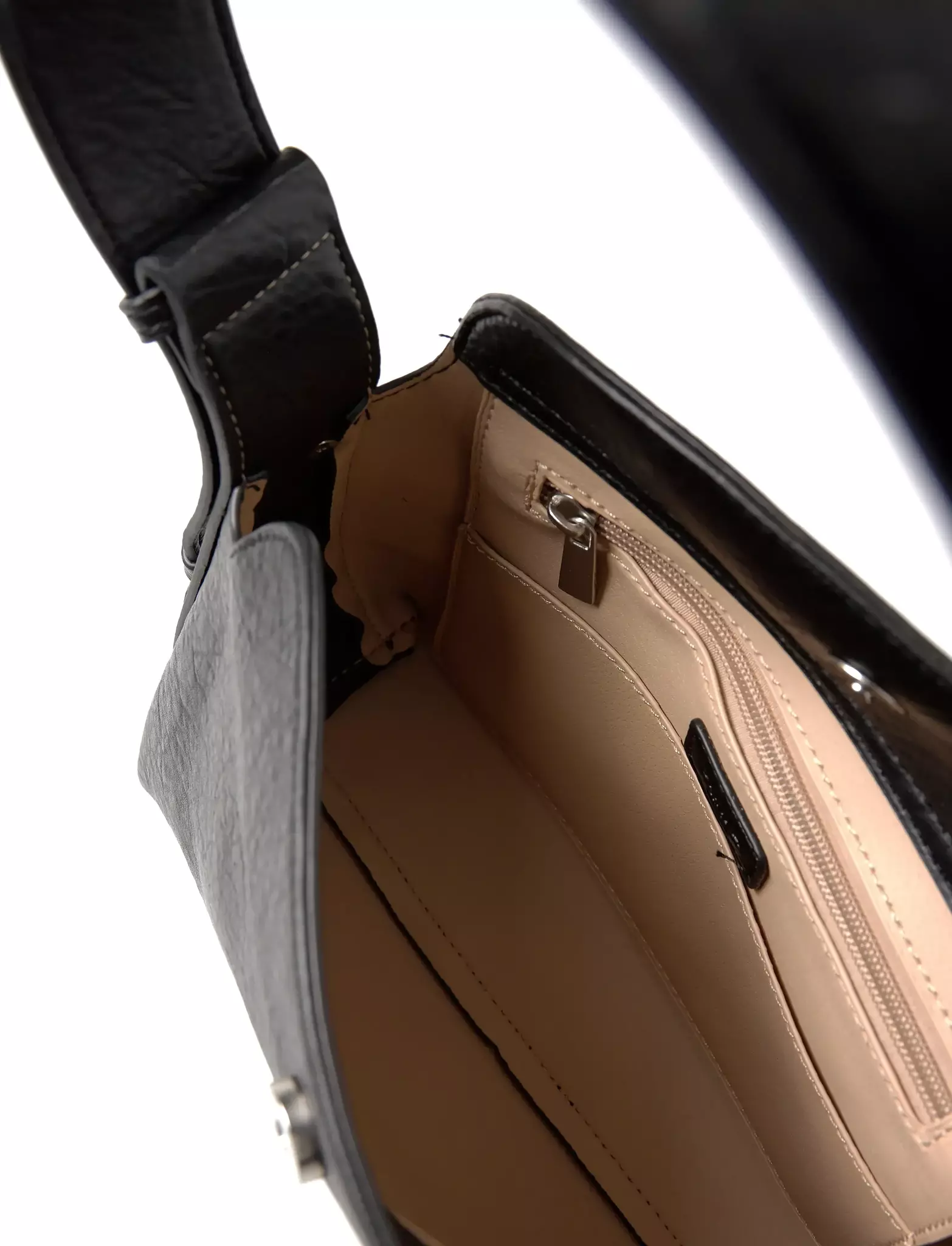 Väskan har en välorganiserad insida med tre innerfack, varav ett med dragkedja för värdesaker som mobil, kort eller nycklar. Den smarta uppdelningen gör det enkelt att hålla ordning utan att väskan känns stor eller klumpig.